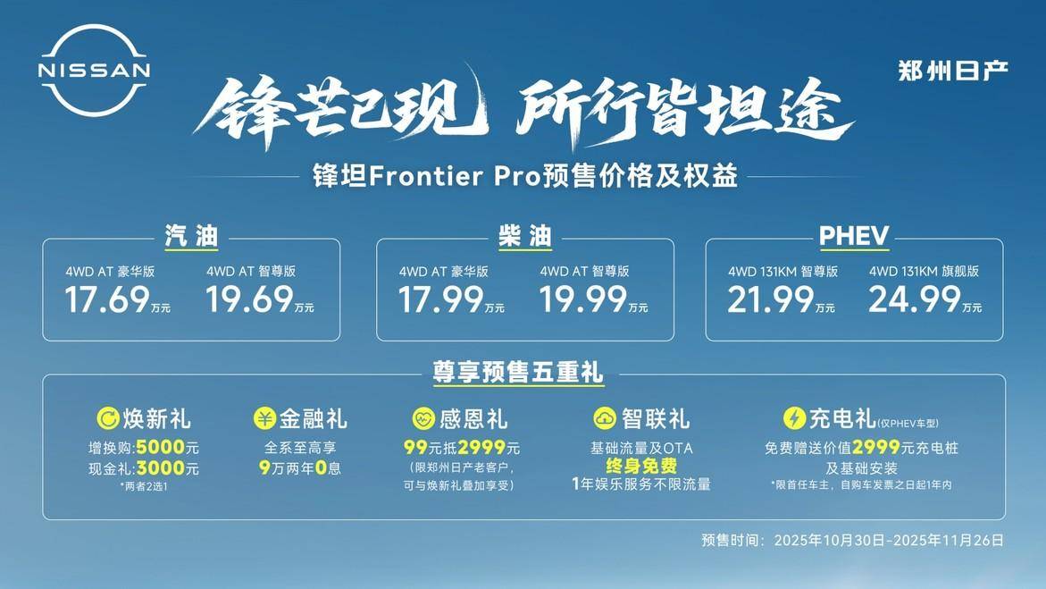 有车网特约报道:10月30日,“锋芒已现 所行皆坦途——Frontier Pro预售暨品鉴交流会”成功举办,郑州日产Frontier Pro正式开启预售,6款配置可选!锋坦Frontier Pro预售价格17.69万-19.99万元,锋坦Frontier Pro PHEV预售价格21.99万-24.99万元。