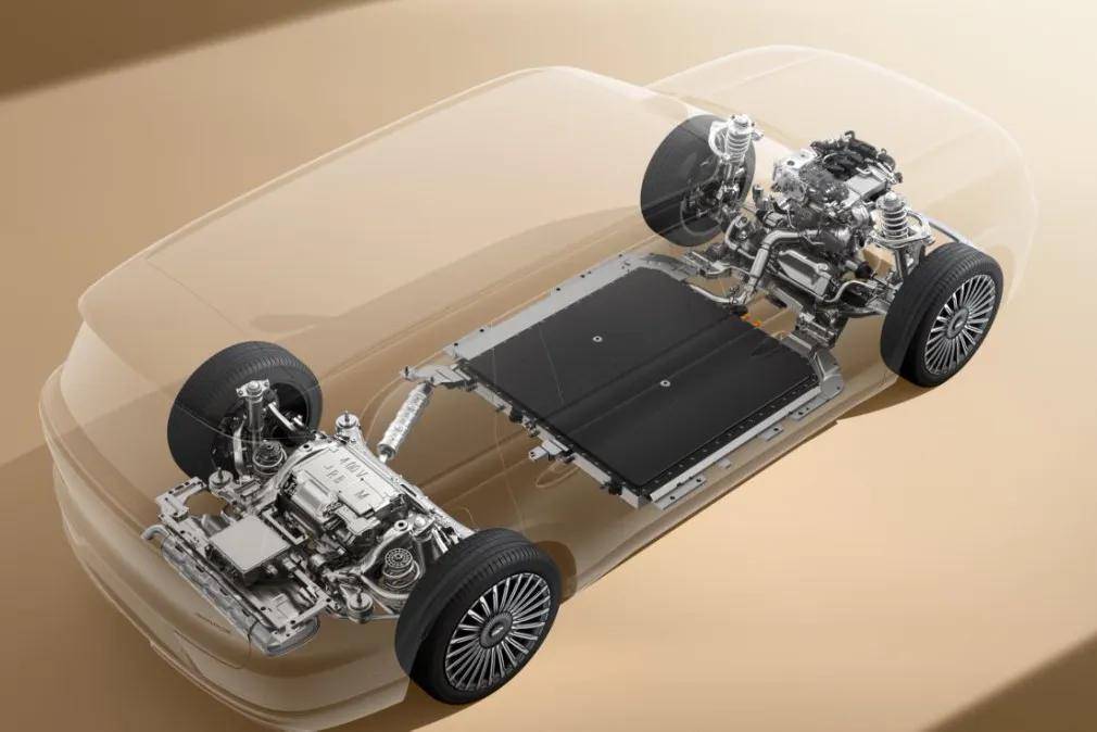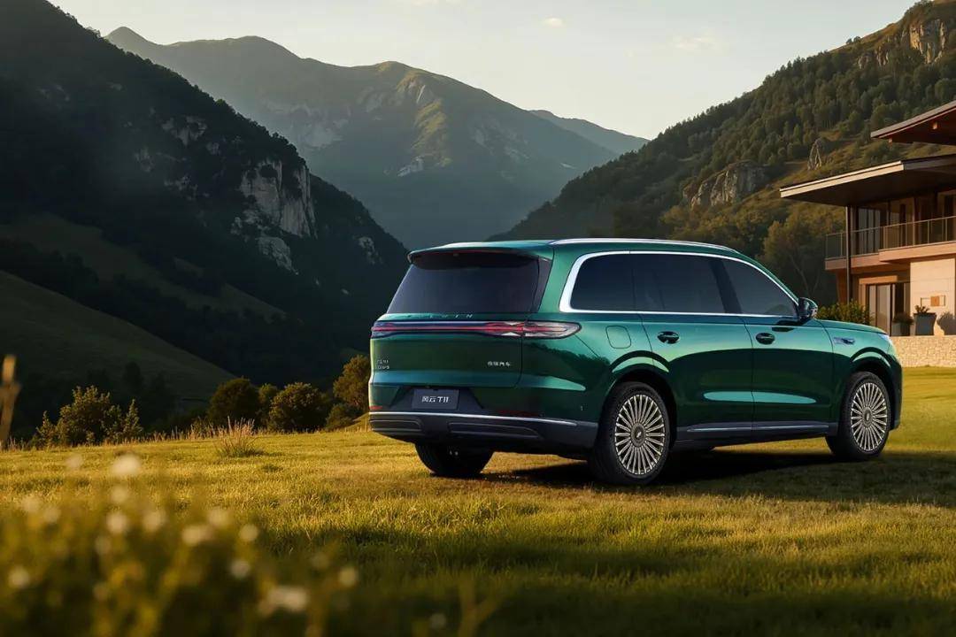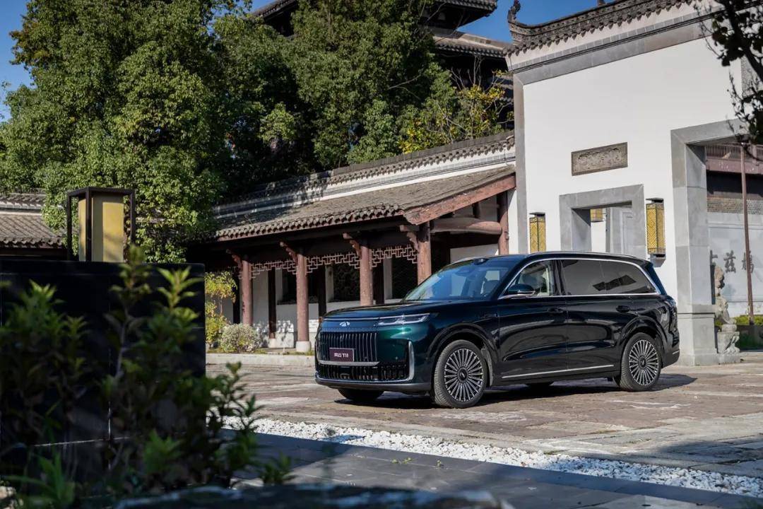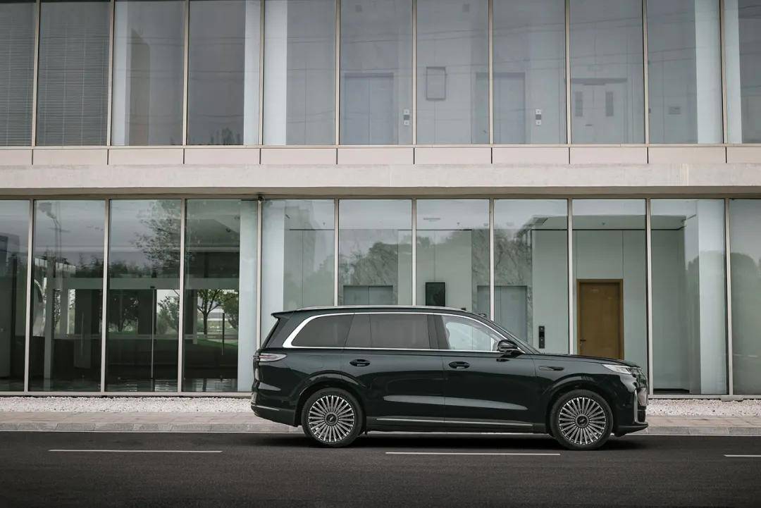 侧面整体造型较为厚重,贯穿式“中轴腰线”展现东方秩序感,搭配21寸的密辐轮毂显得更具旗舰气质。车身的长宽高分别为5205、1998、1800mm,轴距为3120mm。