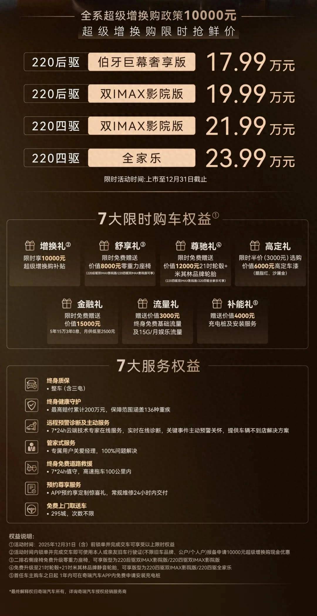 10月30日,风云T11正式上市,共推出4款车型,售价18.99-24.99万元,限时置换价17.99-23.99万元,同时官方还带来7大限时购车权益和7重服务权益。详情请见下图: