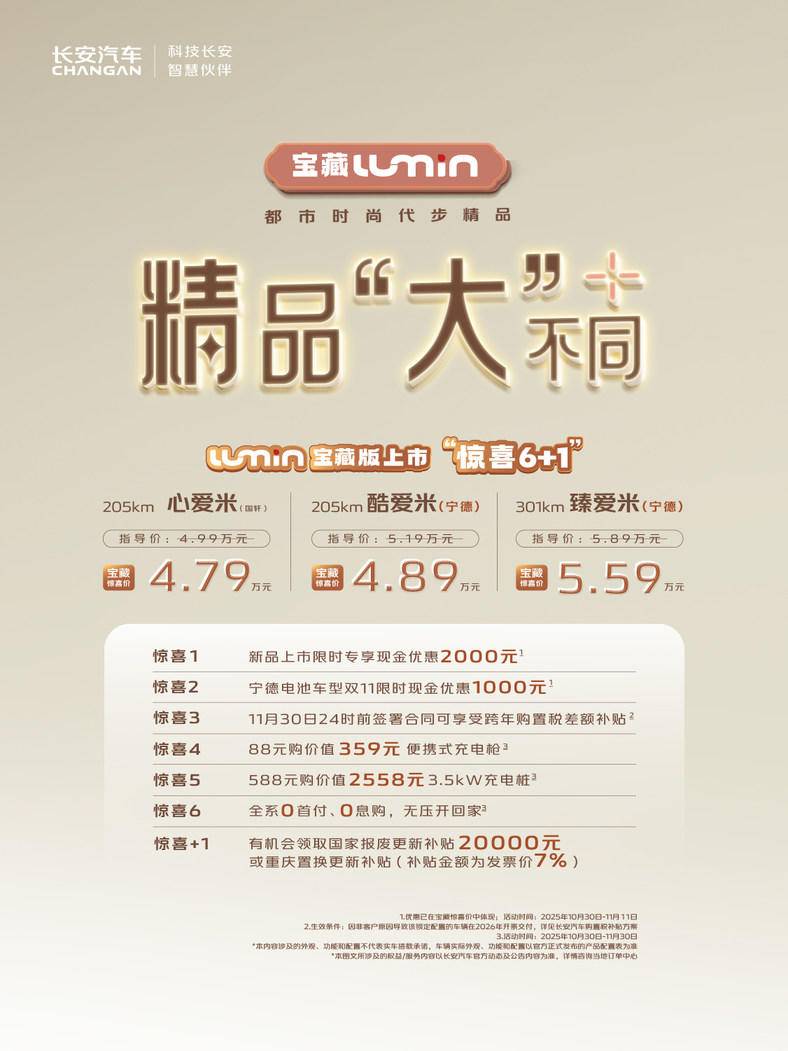 10月30日,长安Lumin宝藏版正式上市,推出三款配置,官方指导价4.79万-5.59万元。作为一款主打都市代步的微型电动车,新车在安全、空间、智能化等方面进行了多项升级,以“惊喜价”切入市场,试图在竞争日益激烈的微型电动车领域树立新的品质标杆。