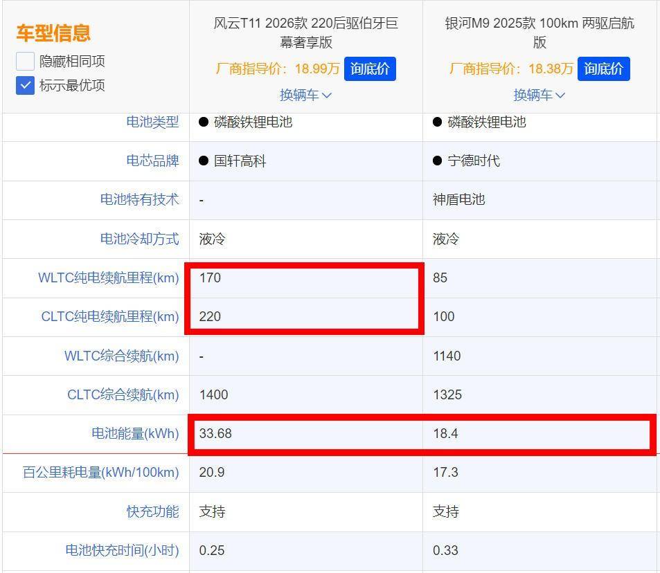 或许也是因为厂家早就料到外界会拿银河M9和风云T11去如此地进行比较,在电池包方面,奇瑞风云T11最低配车型便给配备了33.68度的电池包,CLTC纯电续航里程达220km。而银河M9,却只是给的18.4度电池包,CLTC纯电续航仅为100km,那这就体现出了完全不同的造车思路。但不管厂家在车型配置层面上的取舍是啥,单就在纯电续航这块上的较量,很显然奇瑞风云T11比银河M9还是要更有优势一些的。