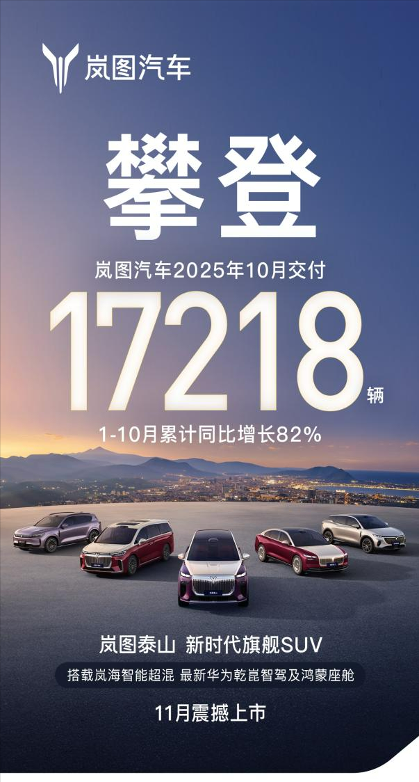 【2025年11月1日,武汉】11月1日,岚图汽车公布10月交付数据。10月,岚图汽车交付17218辆,再创历史新高;1-10月累计同比增长82%,实现稳健“九连涨”,彰显出强劲的增长动能与发展潜力。作为央企国家队,岚图汽车以“产品+资本”双轮驱动,正全力冲刺30万辆新里程,岚图梦想家、FREE+、知音在各自细分市场保持领先地位,岚图泰山、追光L双旗舰引爆市场期待,同时加速登陆资本市场,已向香港联交所递交上市申请,赴港上市进入实质阶段,全力打造央国企高端新能源第一品牌。