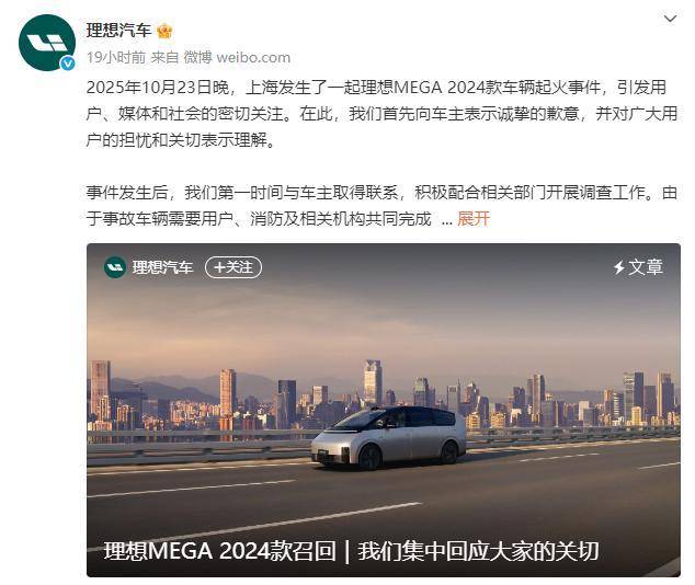 不过值得关注的是,理想汽车在官方微博发文称,对10月23日晚上海理想MEGA 2024款车辆起火的车主表示诚挚的歉意,此事件引发了用户、媒体和社会的密切关注。在事件发生后,理想第一时间与车主取得联系,并积极配合相关部门开展调查工作。但由于事故车辆需要用户、消防及相关机构共同完成勘验与检测,整个程序严格且耗时较长,截至目前,尚未形成最终的技术结论。