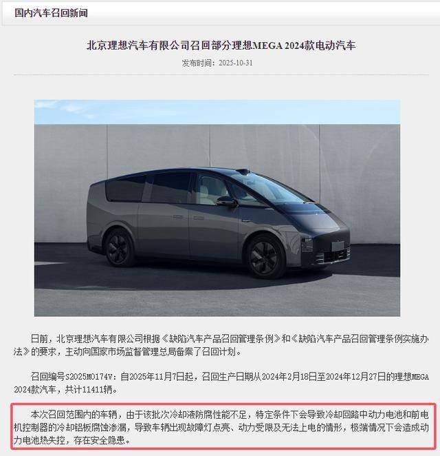 而理想汽车对该事件也相当重视,而在10月31日,据国家市场监督管理总局网站消息,理想汽车主动向国家市场监督管理总局备案了召回计划。此次涉及召回的车辆为生产日期从2024年2月18日至2024年12月27日的理想MEGA 2024款汽车,共计11411辆。