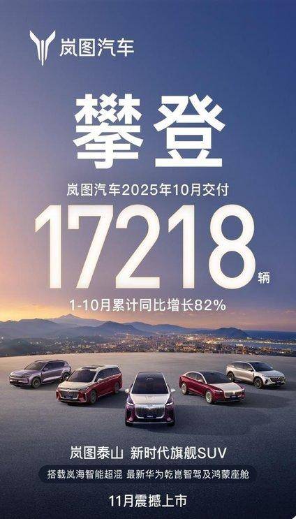 11月1日,岚图汽车公布10月交付数据。10月,岚图汽车交付17218辆,再创历史新高;1-10月累计同比增长82%,实现稳健“九连涨”,彰显出强劲的增长动能与发展潜力。作为央企国家队,岚图汽车以“产品+资本”双轮驱动,正全力冲刺30万辆新里程,岚图梦想家、FREE+、知音在各自细分市场保持领先地位,岚图泰山、追光L双旗舰引爆市场期待,同时加速登陆资本市场,已向香港联交所递交上市申请,赴港上市进入实质阶段,全力打造央国企高端新能源第一品牌。