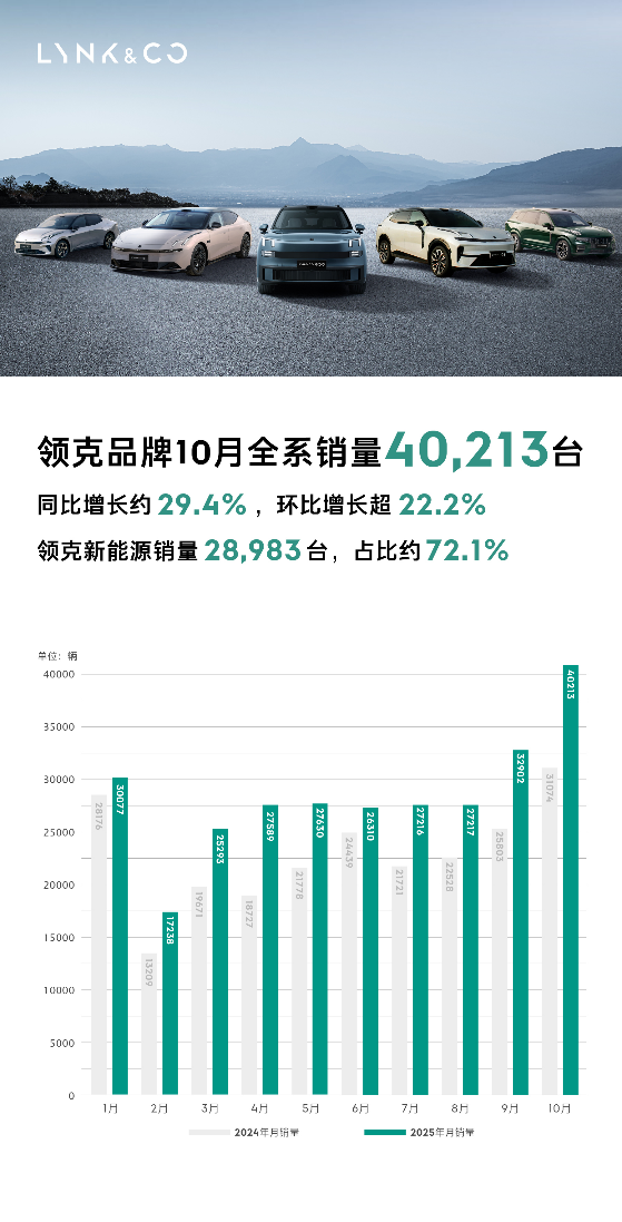 【2025年11月1日,杭州】2025 年 10 月,领克品牌迎来历史性突破:单月销量达40,213 台,同比增长约29.4%,环比增长超22.2%。在实现规模跨越的同时,品牌加权平均价突破20万元,领克用高价值的产品质量和用户运营,构建品牌向上的核心竞争力。2025 年 1-10 月,领克累计销量281,685台,同比增长约24.3%。自 2017 年首款车型投放以来,品牌累计销量已近 162 万台,以持续稳健的增长势头,赢得市场认可和用户青睐。