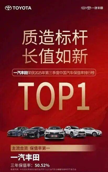 长期主义展示在一汽丰田在产品可靠性等关键领域下足了功夫,就如马拉松大赛对保障用车的首先要求就是要绝对安全可靠。成立22年来,一汽丰田始终坚守“品质保障”的金字招牌,将对品质的严苛管理注入每一个生产环节,不仅保证不良产品“不流向用户”,更严苛到不流入“下一个工序”。也因此,一汽丰田的每一款车都自带高品质、高耐久性、高可靠性的QDR属性,成为用户跨越时间周期的品质之选,并保持着极高的保值率,在贸促会汽车分会发布的2025第三季度汽车保值率排行榜中,一汽丰田以三年保值率50.52%的成绩,荣膺主流合资品牌第一名。