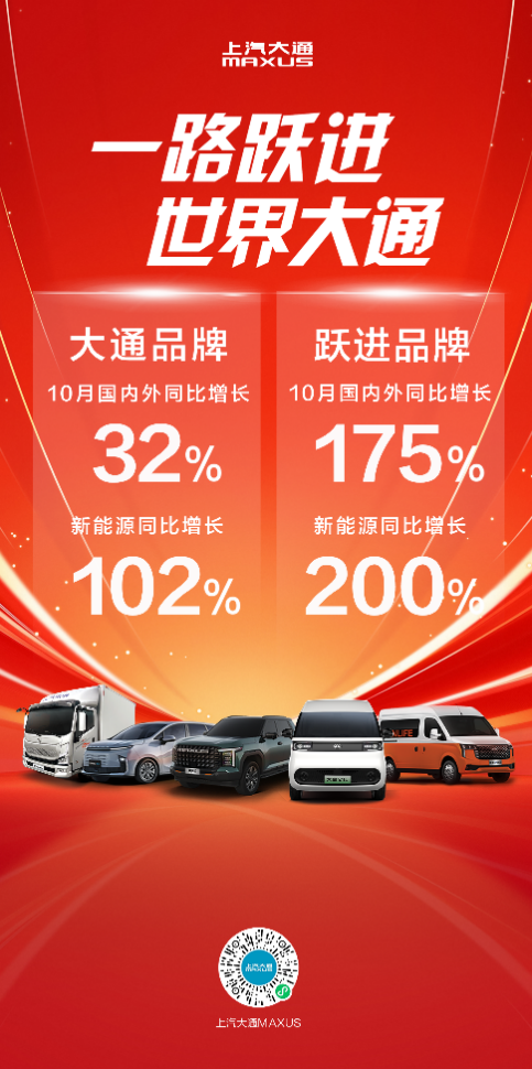 “银十”收官,大通九连增势如破竹:10月销量同比增长48%,零售达20,586辆,实现开年以来“九连增”。新能源车型销量同比增长133%。“中国轻客第一品牌”依然地位稳固,轻客10月零售8,204辆,同比增长22%,其中大拿销量更劲增184%,高品质纯电轻客新款大拿乘胜进军大VAN市场;皮卡延续增长势能,10月零售4,990辆、环比增长11%;跃进轻卡继续“一路跃进”,10月热销4,013辆、同比增长175%。