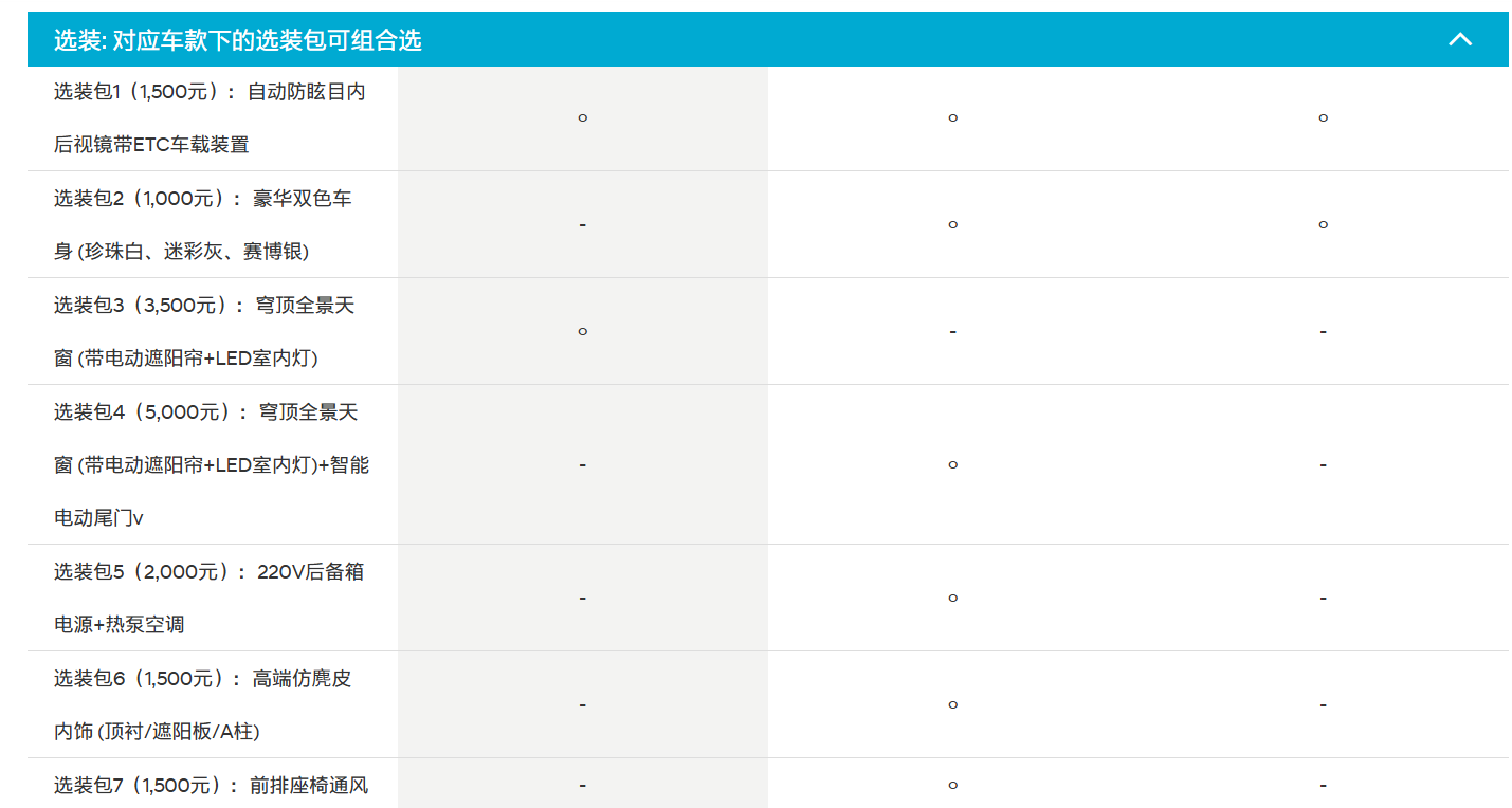 另外,如果觉得动力和续航还不够,其实官方还给了选装包可选,比如选大电池版,CLTC续航能达到722km(20000元),又比如四驱+大电池+20英寸轮毂(35000元)等等。这里吐槽一下,新车的中低配并没有热泵空调,这个和220V后备箱电源一起选装的话要2000元,要知道热泵空调在国产车上都是标配。下面直接看具体的配置:
