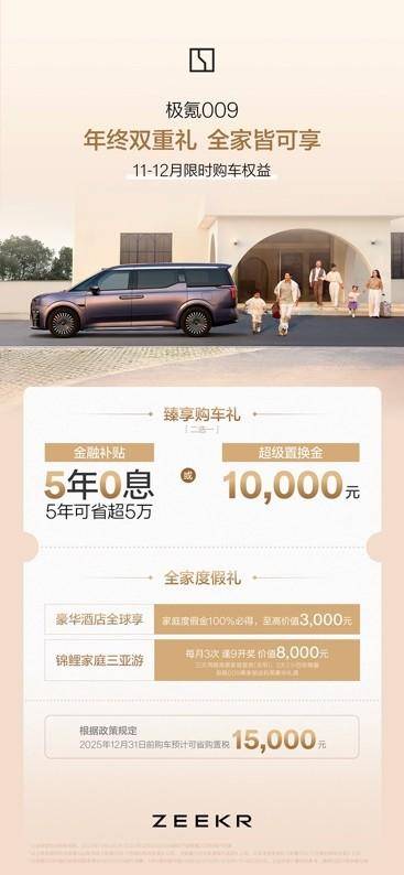 其中,豪华旗舰MPV极氪009推出11-12月限时购车权益:可享5年0息金融方案或10000元超级置换金;用户下定还有机会获得价值至高超10000元的全家度假礼。截止目前,已有超过50%用户购买极氪009作为家庭用车。