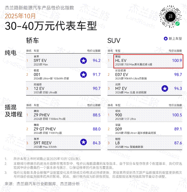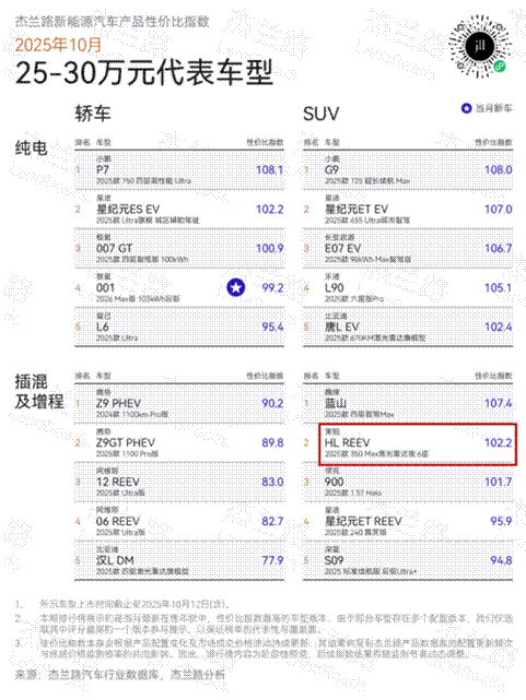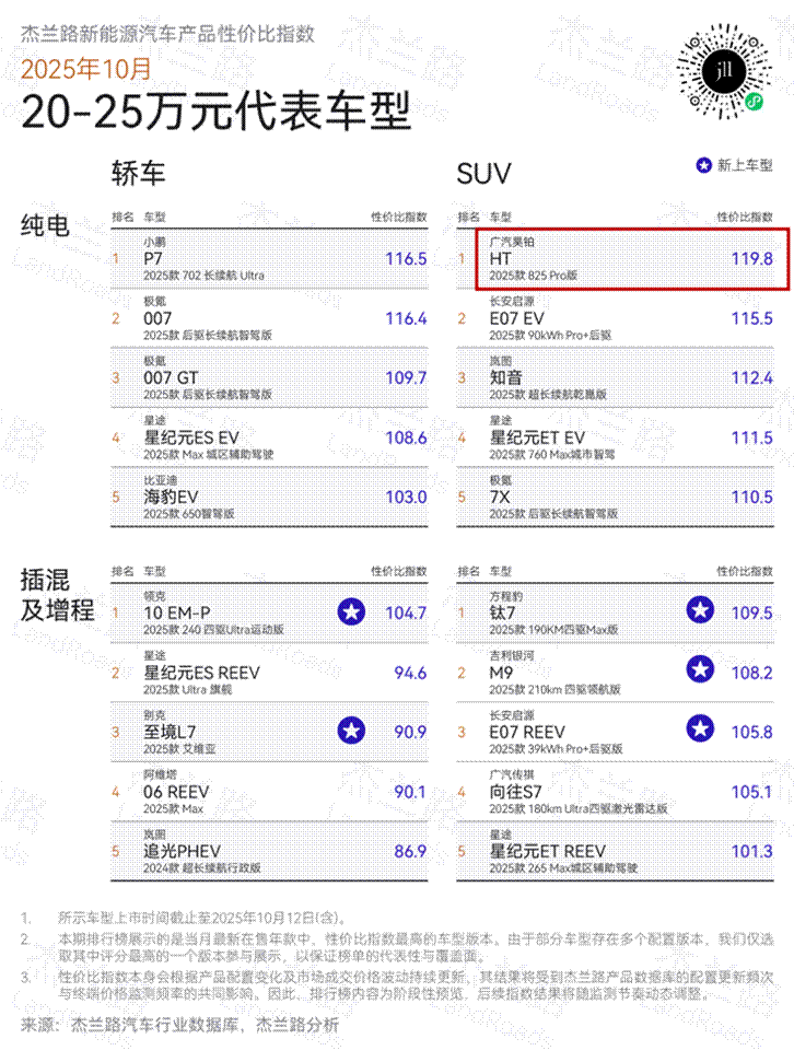 近日,杰兰路正式发布10月新能源汽车产品指数榜单,广汽昊铂旗下车型凭借卓越的产品实力与豪华配置,在多个细分市场榜单中名列前茅:昊铂HT 2025款825 Pro版位列20-25万级纯电SUV第一;昊铂HL EV 750 Max六座激光雷达版位列30-40万级纯电SUV第一;昊铂HL REEV 350 Max六座激光雷达版位列25-30万级插混及增程SUV第二。