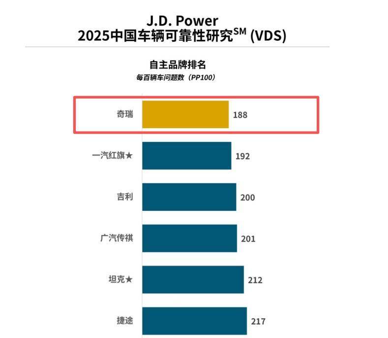 图为奇瑞获得J.D. Power2025中国车辆可靠性研究(VDS)自主第一