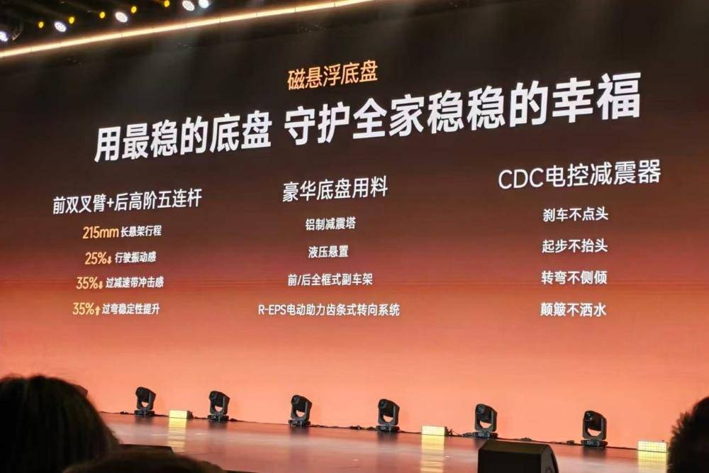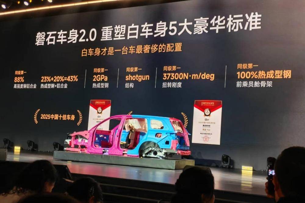 “白车身是最大的豪华”,发布会现场把风云T11全系标配的磐石车身2.0展示给你看,整车高强度钢铝合金占比达88%、热成型钢强度达2Gpa、扭转刚度为37300N·m/deg,用学用总的话来说就是“堆料堆到令人发指”。坚固的白车身不仅关乎安全,也有助于猎鹰高阶辅助驾驶系统的稳健表现,同时高强度车身结构减少了振动对声场的干扰,因此也是伯牙之音豪华音响系统卓越音效的基础保障。