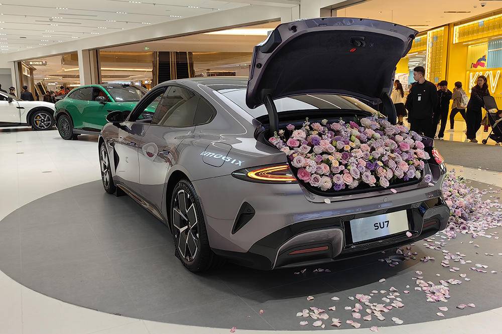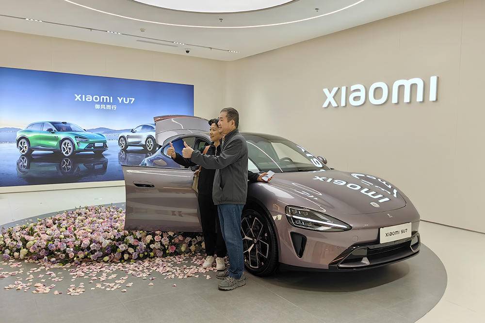 在汽车展示区,小米SU7和小米YU7无疑是智能出行的焦点。年轻人的第一台纯电轿车——小米SU7,满载鲜花而来,凭借个性而耐看的颜值,以及智能科技的魅力,既吸引了年轻人驻足,更吸引了不少心态年轻的米粉合影打卡。
