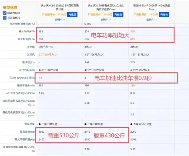 目前燃油XC60的市场成交价已经到了25万元左右,XC70作为中大型新能源SUV,尺寸和级别更高,26.99万元的起售价与XC60高度重叠。二者比较起来,作为新能源的XC70在功率、扭矩都更大的前提下,却比油车XC60的加速更慢,而且载重量比也少了100公斤。XC70的性能还不如XC60,如果卖得比X60贵就难以让人买单。