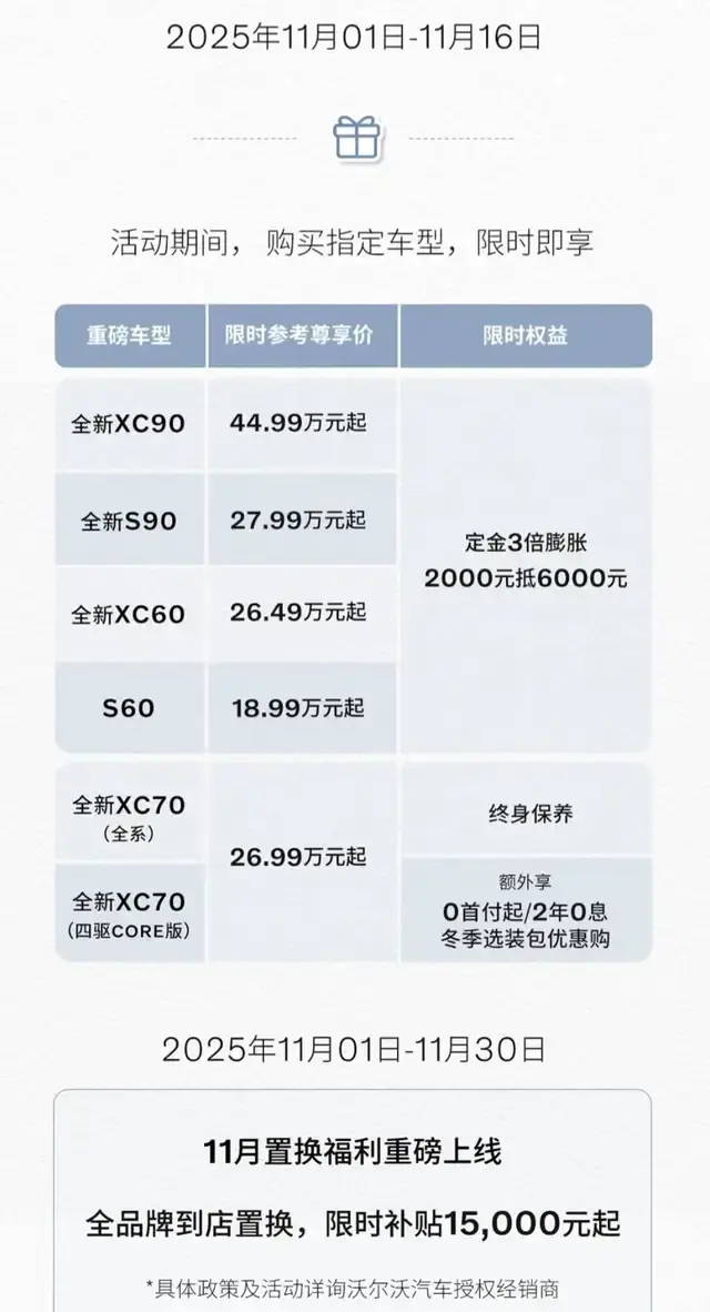 根据沃尔沃官方11月1日发布的促销政策,今年11月1日至11月16日,购买指定车型限时享受优惠政策,其中XC70限时参考尊享价26.99万元起(与之前没有变化),限时权益增加了免费终身保养。值得注意的是,沃尔沃宣布自11月1日至11月30日,全品牌到店置换限时补贴15000元起。