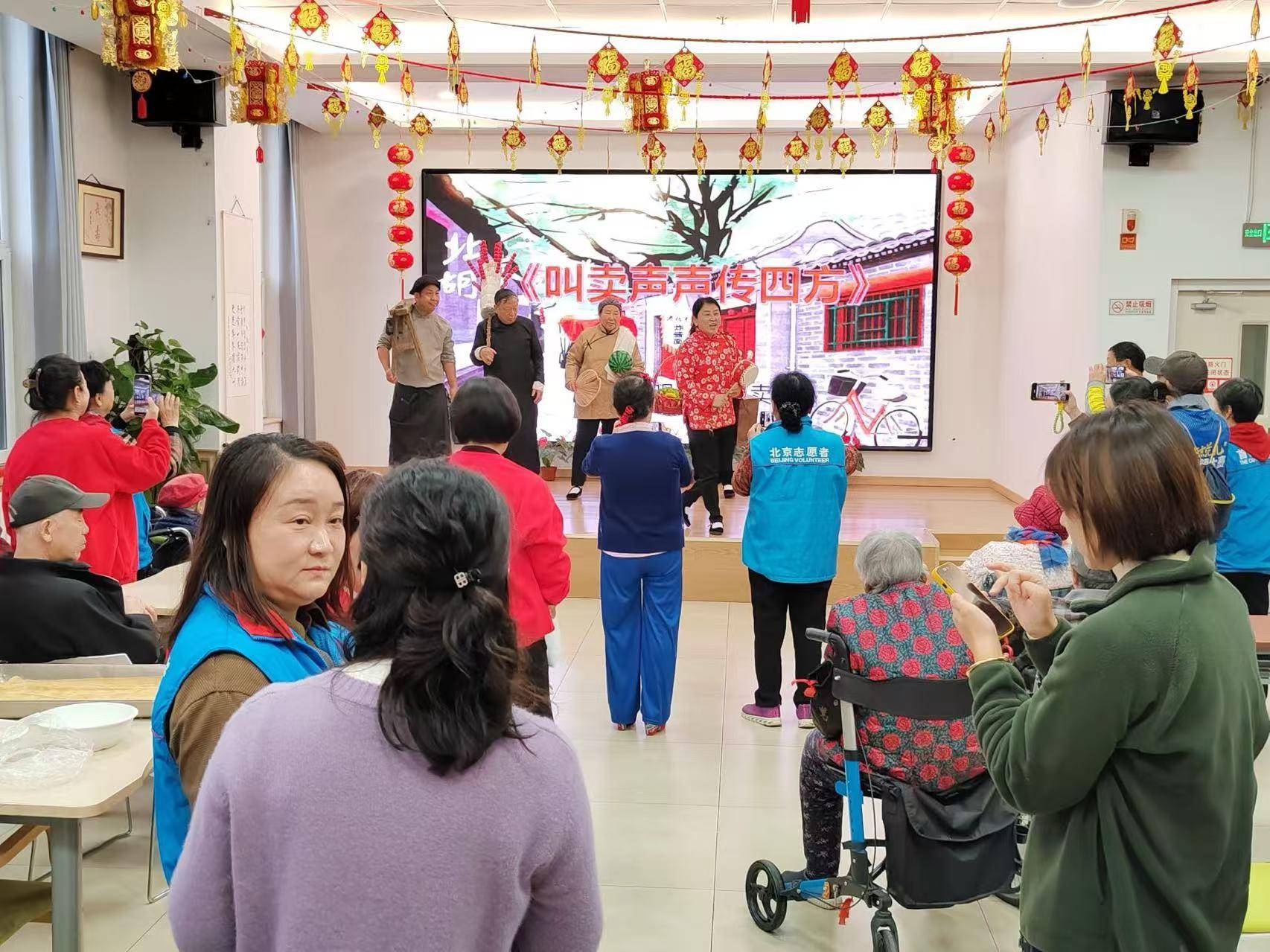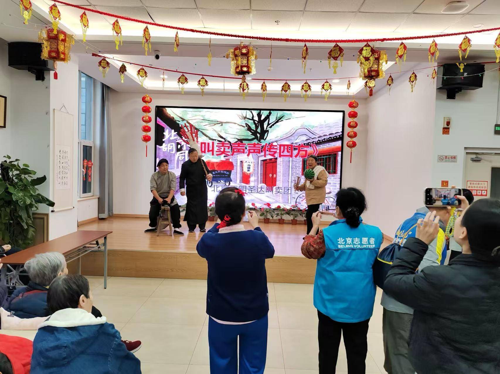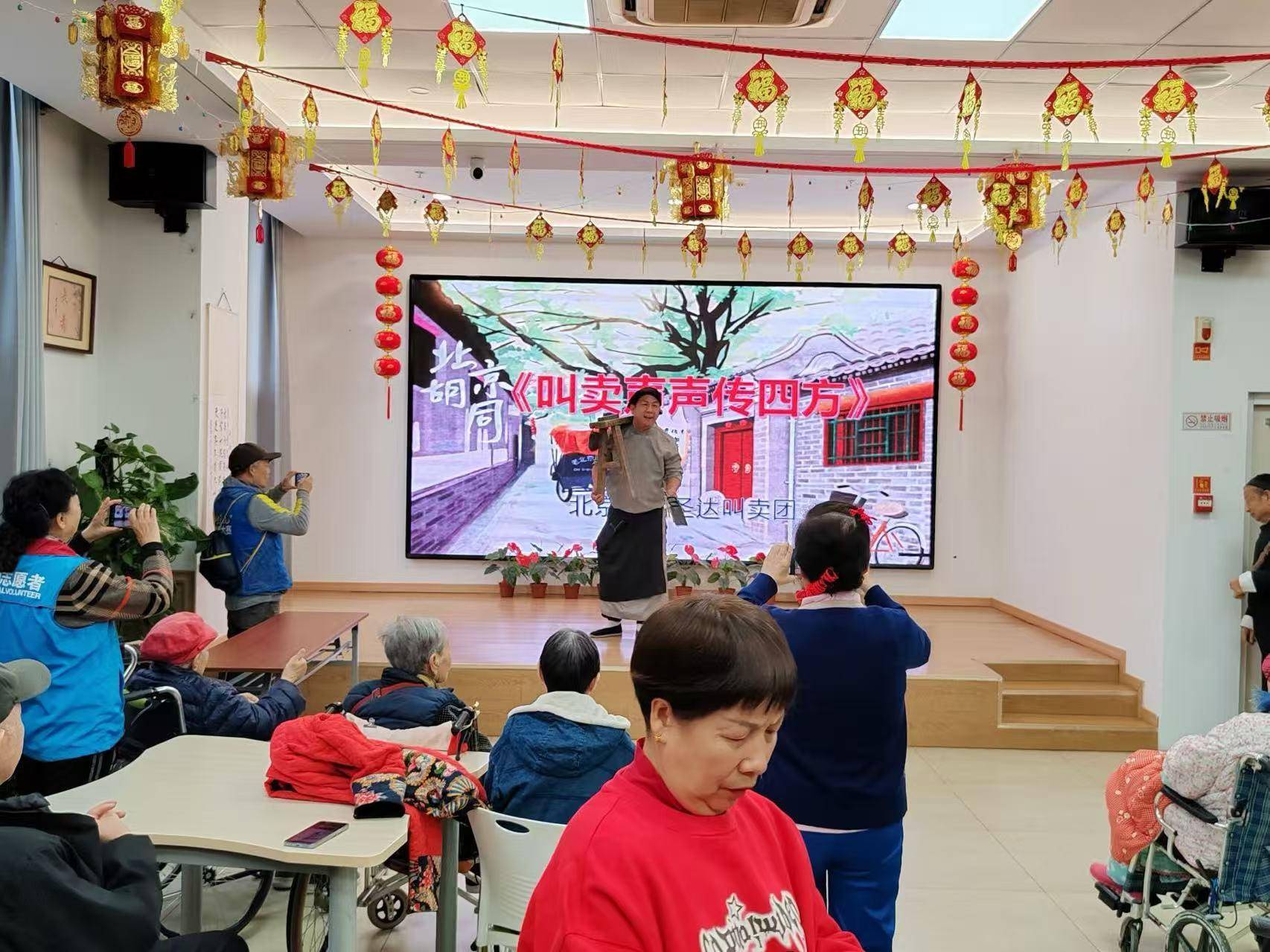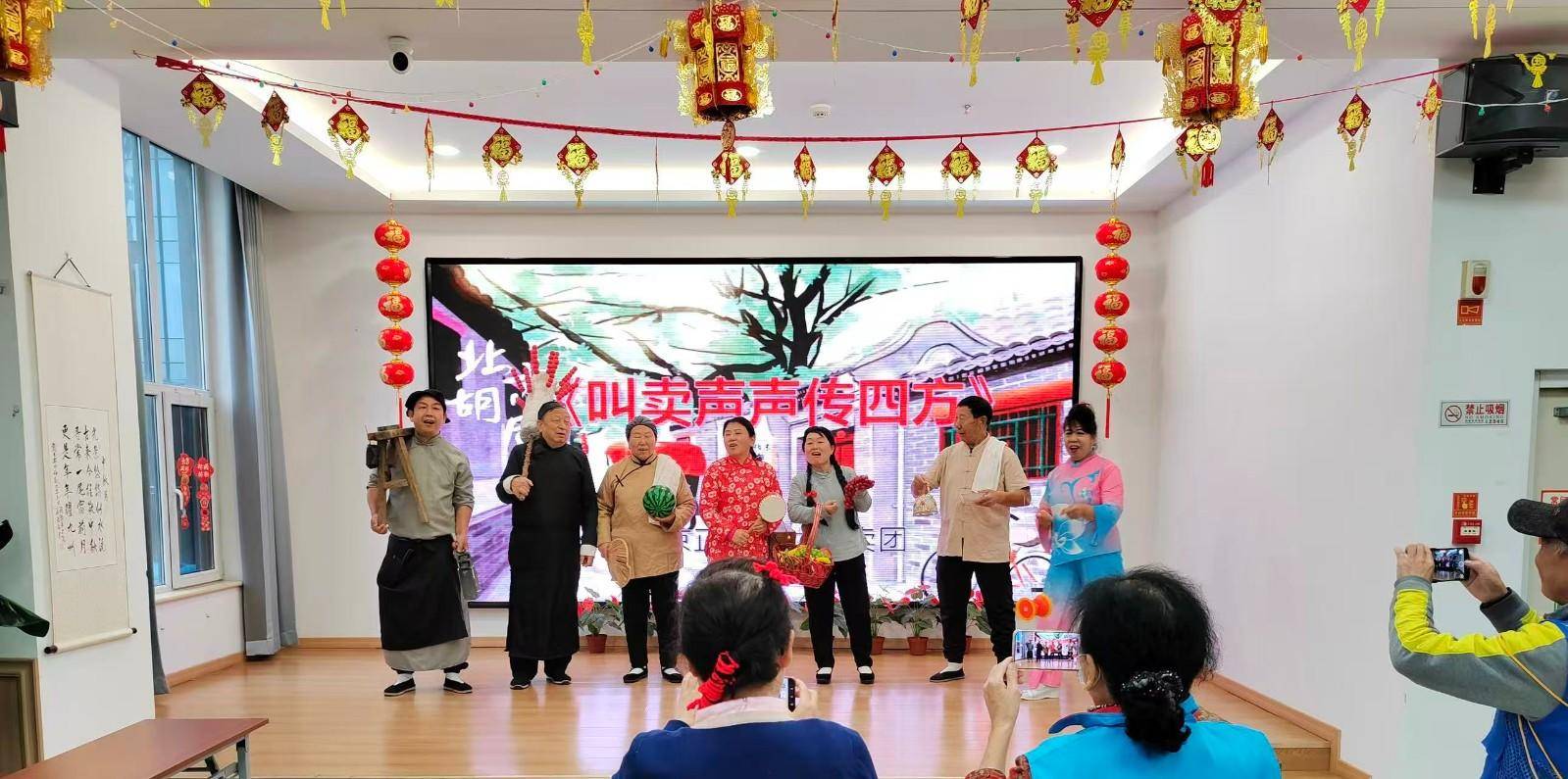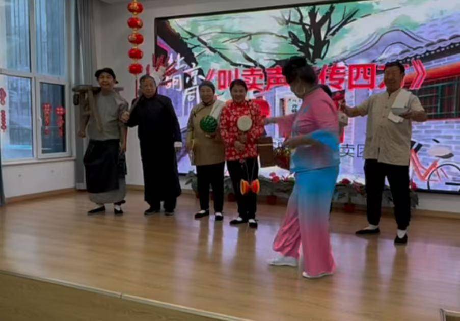 演出现场似穿越时光隧道,回到老北京胡同。七位表演者身着传统服饰,自信站在木质舞台上。背景LED大屏幕展示老北京胡同景观,斑驳砖墙诉说岁月故事,错落屋檐展现独特韵味,热闹街市让人仿佛置身往昔。舞台上方悬挂的红色灯笼和“福”字拉花等传统装饰,与大屏幕画面相互映衬,营造出浓郁温馨的老北京氛围。表演者们笑容满面,生动再现市井风情,打开老人们记忆大门,让他们倍感亲切温暖。