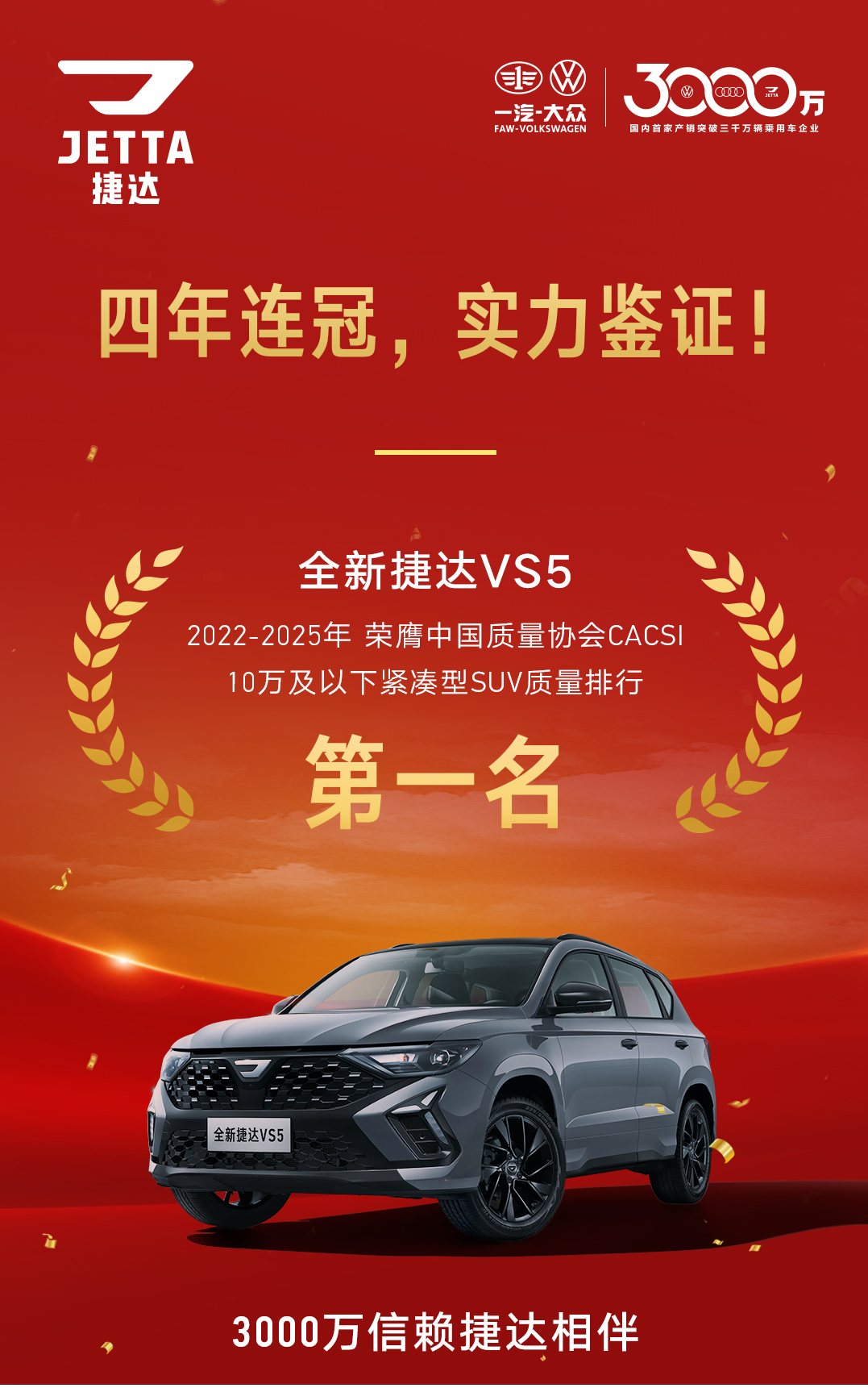 而捷达的品质实力,同样在权威评选中得到反复验证。根据中国质量协会发布的“中国汽车行业用户满意度指数(CACSI)”测评结果,捷达品牌旗下车型屡创佳绩。其中,捷达VS5表现尤为突出,自2022年起至2025年,已连续四年蝉联“10万及以下紧凑型SUV”用户满意度第一。 此外,捷达VA3、VS5、VS7也在2022年时,分别在其各自所处的细分领域夺得用户满意度第一名。这些荣誉,不仅是对捷达传承德系品质的肯定,更是一汽-大众深耕中国市场、精准满足用户需求的最佳证明。