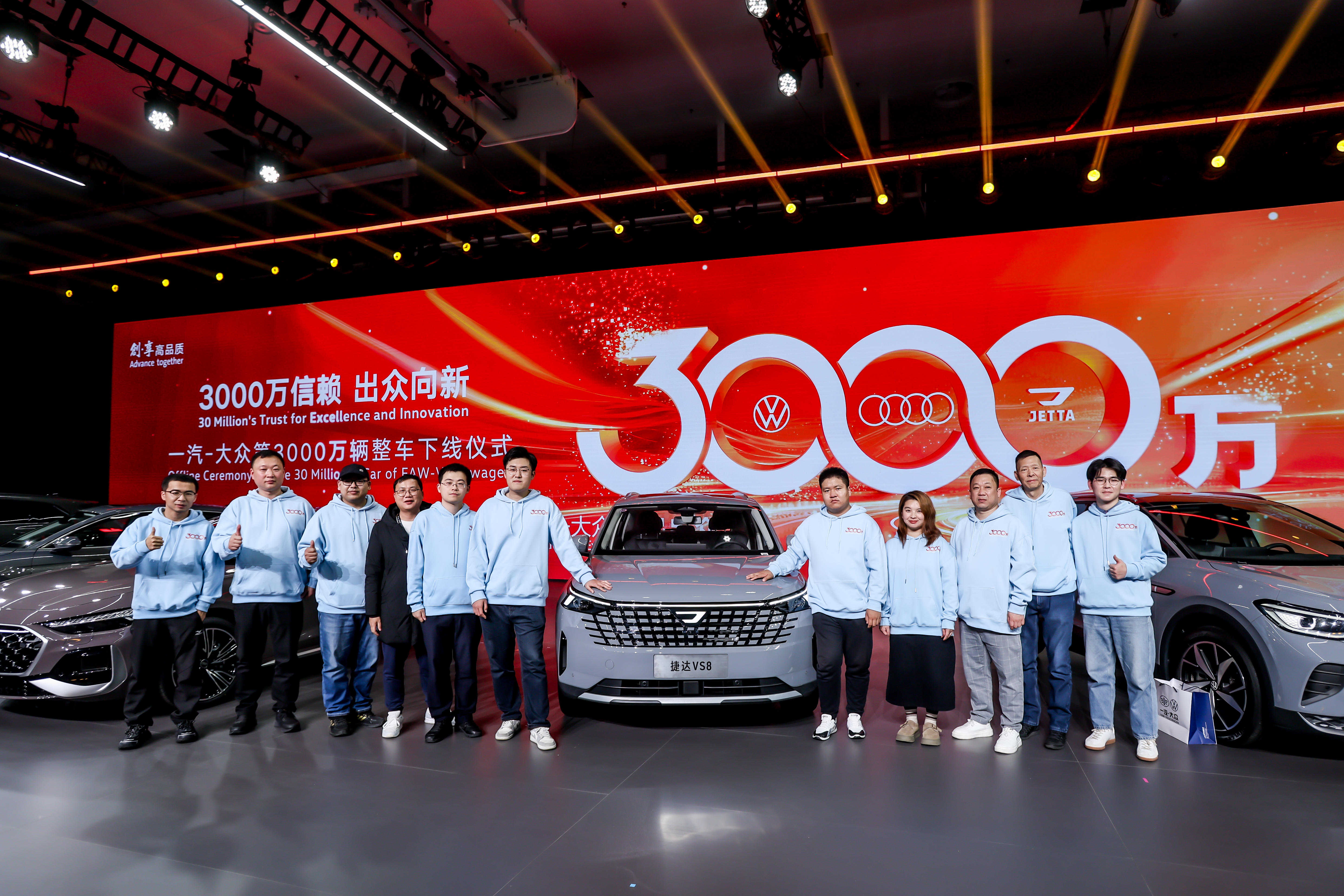 2025年10月30日,一汽-大众迎来其发展史上的高光时刻——第3000万辆整车下线仪式在长春总部隆重举行。在此次以“3000万信赖 出众向新”为主题的盛典上,随着捷达VS8作为3000万里程碑车型之一,同大众、奥迪品牌旗下的5款不同车型来到台前,一汽-大众也正式成为了国内首个产销突破3000万辆的乘用车企。