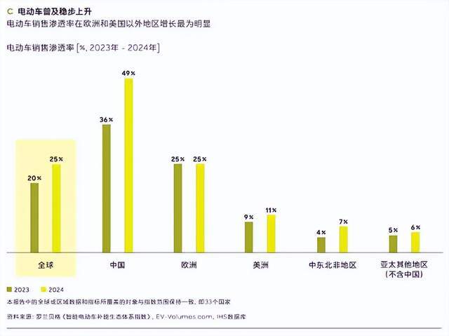 2024年,中国电动车销售渗透率达到49%,远超全球25%的平均水平,而同期众多成熟市场的新能源渗透率几乎没有增长。