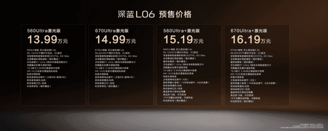 深蓝L06已正式开启预售。新车共推出四款配置车型:560Ultra激光版预售价13.99万元、670Ultra激光版预售价14.99万元、560Ultra+激光版预售价15.19万元、670Ultra+激光版预售价16.19万元,预售权益至高可享价值80259元。