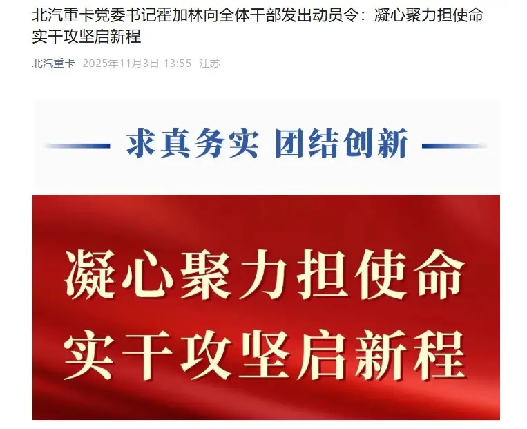 近日,从北汽重卡官方获悉,霍加林已经出任北汽重卡党委书记。在北汽重卡近期的官方推文中,霍加林均以北汽重卡党委书记的身份出现,其中11月3日推文标题直接为《北汽重卡党委书记霍加林向全体干部发出动员令:凝心聚力担使命 实干攻坚启新程》。在该文中,霍加林提出,北汽重卡要在四季度冲刺期锚定目标不放松,勇于担当、敢于履责,直面困难、迎难而上,强化执行、抓好落实,坚决打赢2025年决战决胜“收官战”。