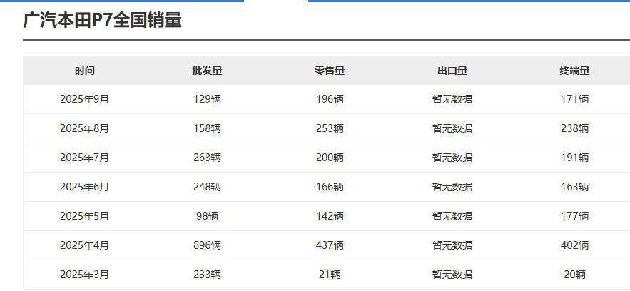 来自第三方平台的销量数据显示,广汽本田P7今年4-9月份零售量分别为437辆、142辆、166辆、200辆、253辆、196辆,换言之,自上市至今已经近半年,但广汽本田P7的累计零售销量也并未达到5000辆,