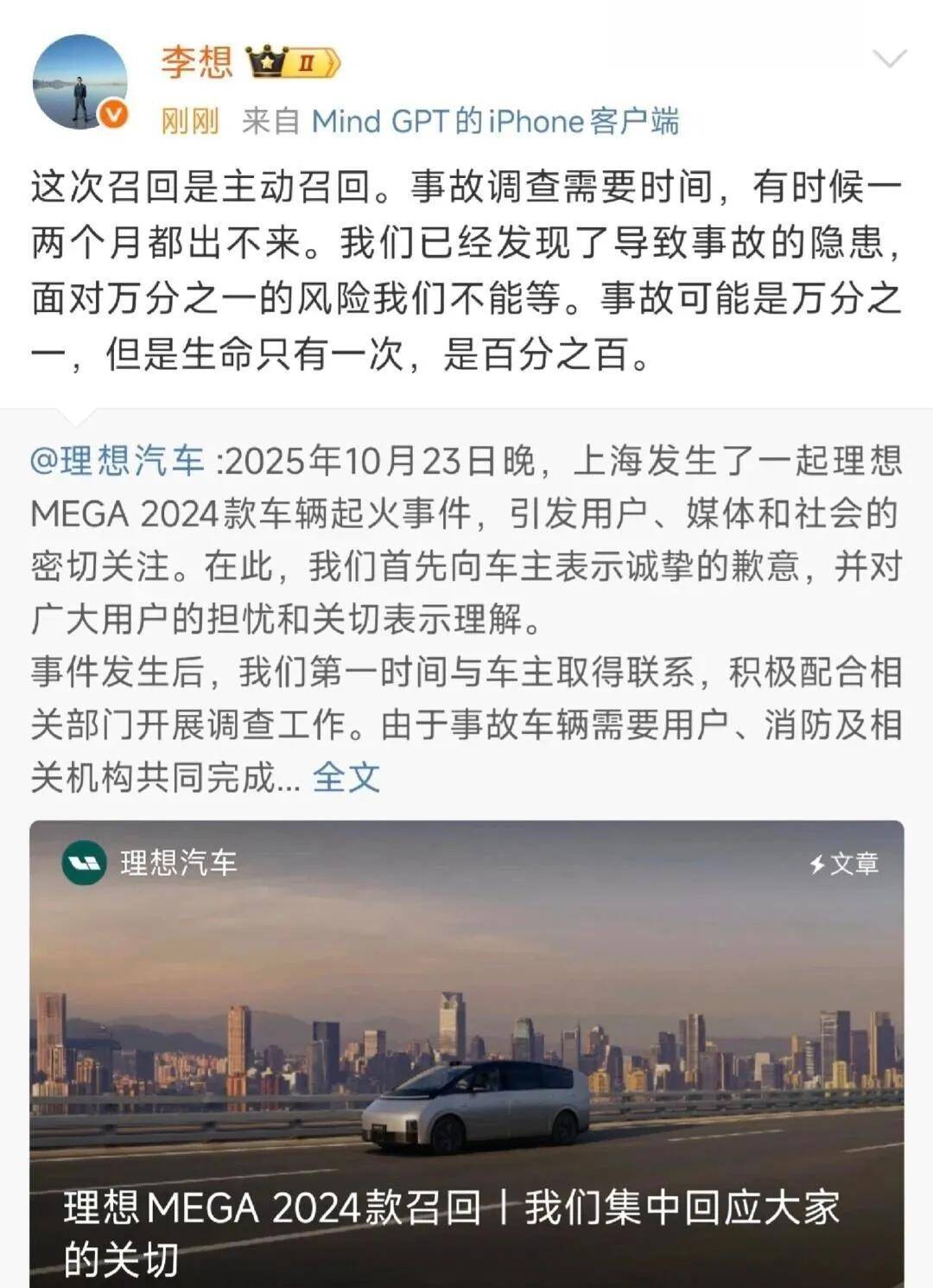 不回避、不甩锅,召回背后是责任,更是代价,仅电池更换一项,就意味着数亿元的真金白银,理想没去赌那“一万多分之一”的概率,而是主动选择全线召回,错了就认、全额买单,这种 “立正罚站” 的态度,在当下浮躁的造车氛围中,显得尤为难得。