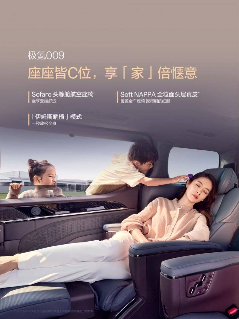 不止在商务领域取得成功,极氪009在家用MPV市场也迎来爆发式增长,据统计,超过50%用户购买极氪009作为家庭用车,并对使用体验称赞有加。极氪009七座过道版,在保留六座商务版豪华基因的基础上,针对家庭用户做到了更全面、更细致入微的关怀。在“公路坦氪”的安全堡垒之上,还将健康安全做到极致,带来“母婴级”双环保认证座舱、国家最高等级“AA级”护眼灯等配置和设计,全方位守护家人孩子的健康安全。在7.4㎡超大内部空间里,带来豪华MPV最宽敞的中央通道,加上一级台阶设计,不仅进出第三排方便,老人孩子上下车也更便利轻松,从容应对“三代同堂”的全家出行场景。同时,搭载极氪首创的儿童守护APP,重点关注0到12岁的儿童乘车出行的需求,帮助家长轻松带娃出行。此外,全系标配的Sofaro头等舱航空座椅、MPV唯一“伊姆斯躺椅”模式、行业唯一恒温保鲜冰箱等配置,更让全家人舒享愉悦旅程。极氪009已经成为精英家庭点赞的“保姆车天花板”。
