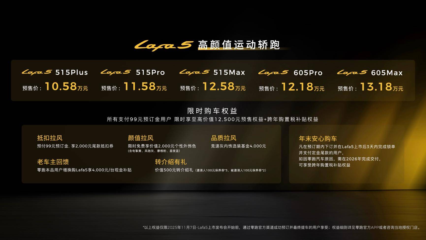 2025年11月7日晚,零跑全新的个性战略新品——零跑Lafa5开启预售,预售价区间为10.58-13.18万元。