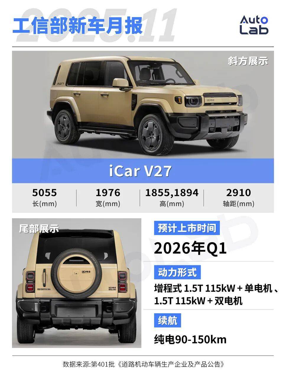 iCar V27的外观和V23一样,依旧是越野的“情绪价值”拉满,融合了丰田LC系列和卫士的风格,但同时LED灯等元素的加入又让它看上去非常现代,很有赛博朋克的感觉。