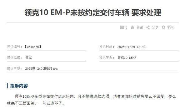第六名领克10 EM-P:投诉量140起,投诉问题与MG4类似,集中在订金纠纷和交车延迟,反映出新能源市场快速扩张背景下,车企在供应链管理和订单履约能力上的不足。