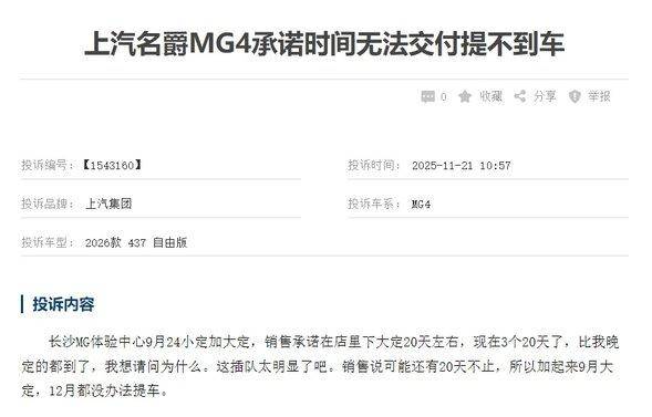 第四名MG4:投诉量177起,核心问题为定金纠纷和不按时交车。作为一款热门新能源车型,订单量过大导致交付周期延长本属常见,但部分车主反映经销商存在"哄抢订单""承诺交付时间无法兑现"等问题,需加强渠道管理。