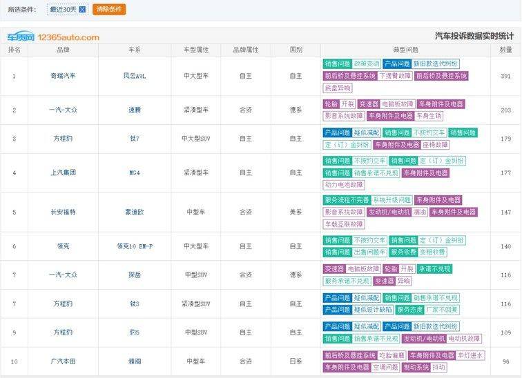 本期榜单呈现出"热销车型集中上榜"的显著特征,其中奇瑞汽车旗下近期销量表现亮眼的风云A9L意外登顶投诉冠军,一汽大众、方程豹等品牌多款车型也因共性问题进入榜单前列。