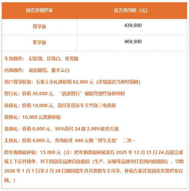 即日起,用户可通过别克官网、iBuick App、Buick小程序、别克抖音直播间,或别克全国授权经销商门店下定。在2025年12月31日24点前完成线上下定并锁单,且于2026年2月28日24点前提车并开票的车主,即可享受限时五重上市礼遇。同时在2025年12月31日24点前完成下定并锁单,且于2026年1月1日至2月28日期间提车并开票的车主,可享15,000元跨年购置税补贴。