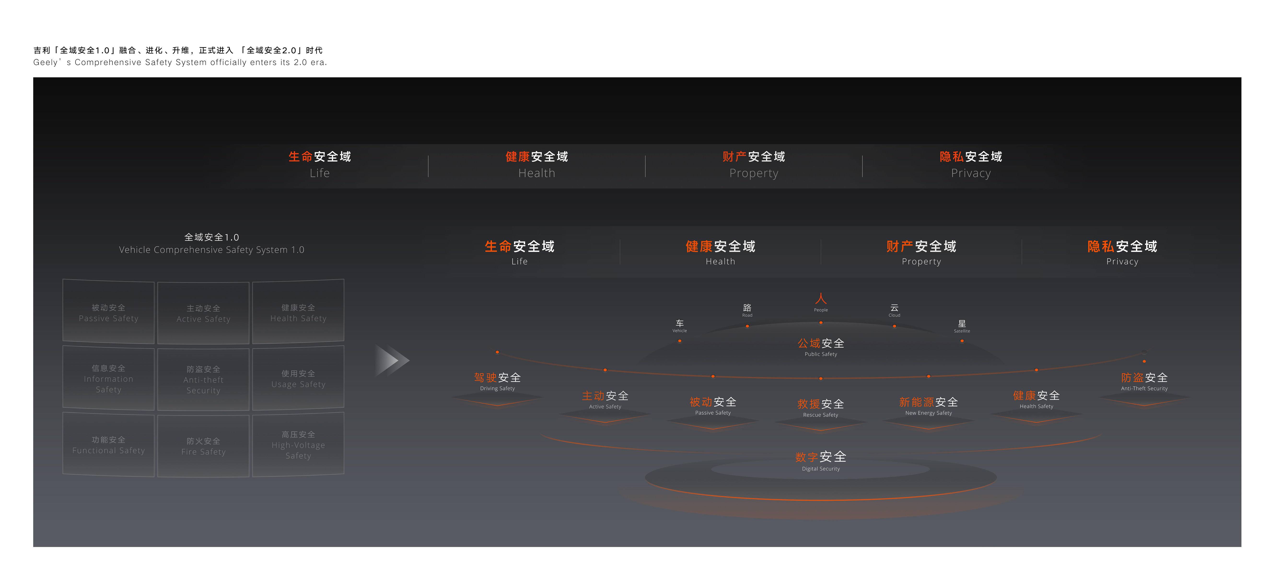 作为行业安全技术的先行者与引领者,吉利在“全域AI”技术体系的赋能下,以“AI为纲 责任为本”,基于原有的“全域安全”技术体系进阶打造“全域安全2.0”技术体系。结合智能时代的安全新需求和新挑战,“全域安全2.0”技术体系秉持“以人为尊”理念,通过技术升级、能力突破与范式创新,将侧重“整车安全”的视角升级为“人-车-路-云-星”的生态视角,旨在贯穿用户出行全场景、覆盖出行全领域、联动出行全生态;并以“生命零伤亡、健康零危害、财产零损失、隐私零泄露”四大安全愿景为指引,逐步构建的一套为消费者提供全面的安全保障技术体系。