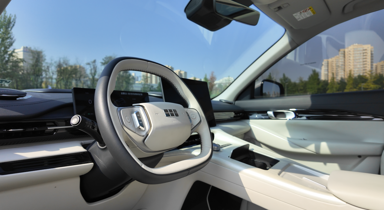 内饰这边,银河E5依旧是比较传统的风格,基本上和其它的银河家族车型类似,使用的便利度等等也都不错,白色的配色也显得特别干净素雅,居家味道很浓郁。作为一辆家用车,这个设计真的没得说。而深蓝S05更加突出一个可玩性,可以左右摆动的向日葵屏幕显示效果细腻不说,内容也多,和驾驶有关的信息都可以显示在50英寸投影的AR HUD上。