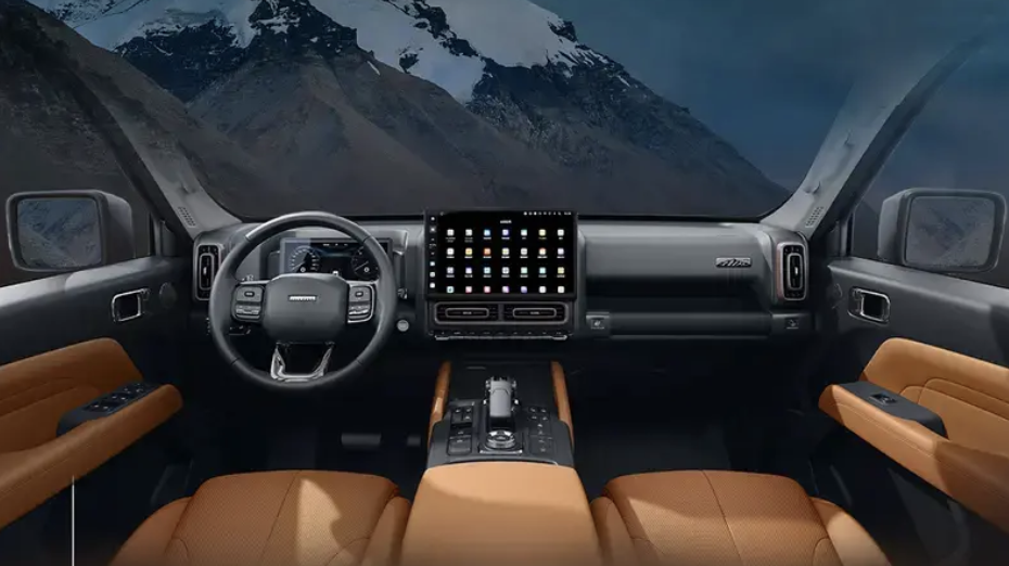 内饰方面,哈弗H9穿越版也基本上延续常规版车型的整体设计,10.25英寸液晶仪表配合14.6英寸的中控屏,车内大面积直线以及矩形元素的应用增加整体硬派属性既视感,同时黑棕配色的内饰也营造出相对高级的车内氛围。