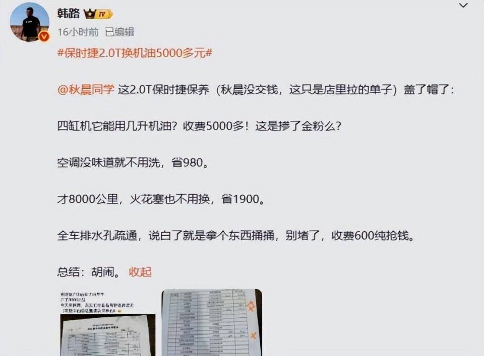 之前有国内知名汽车博主在网上晒出了自己的保时捷保养一次,店端给出的报价单,大家惊诧地看到,一次保养的报价竟然接近1万元,其中换个机油要花五千多元,所以另一位国内知名汽车博主韩路老师直接开喷:四缸机能用几升机油?收费5000多,掺金粉了吗?