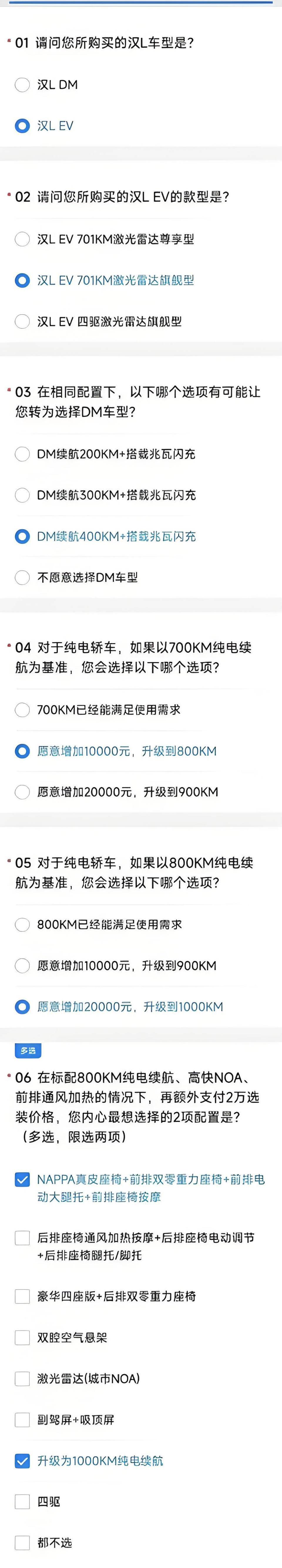 首先是纯电车型,通过调查问卷上的选项,可以看到,比亚迪能够提供900公里和1000公里两个版本选项,前提就在于价格升高多少,用户可以接受,现在比亚迪汉705公里纯电车型的指导价是21.58万元,按照上面的选项,升级到800公里,增量不加价,但是到了900公里续航,价格可能就要到22.58万元!22.58万元,900公里续航,百分百会配上兆瓦闪充,这个性价比表现,在中型、中大型轿车中,也是相当强势的存在了。