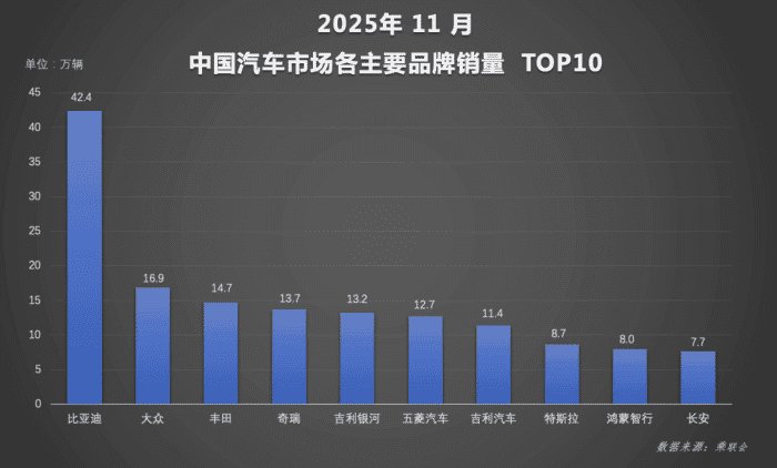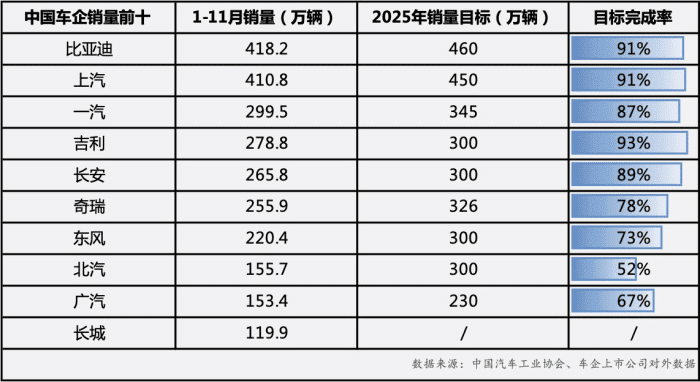 11月车市冲刺阶段,比亚迪表现亮眼持续领跑以超48万辆的月销量创下年内新高,持续领跑中国新能源汽车市场。2025年前11个月,其累计销量达418.2万辆,同比增长11.3%,年度销量目标完成率超九成,随着12月市场发力,超额完成全年目标已成定局。