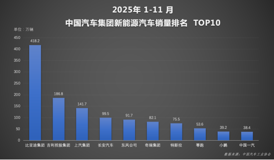 从累计数据看,2025年前11个月比亚迪累计销量418.2万辆,同比增长11.3%,年度销量目标完成率超九成。随着12月市场进入冲刺阶段,比亚迪有望超额完成全年目标。