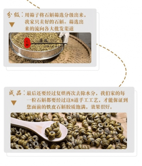 每一粒石斛都要经过8道古法炮制,才能达到合格的标准,采用传统纯手工技术,才能更好的保留石斛原始的形态,让每一粒石斛胶质饱满。当然由于手工加工技术难度很大,熟练的工人,平均每人每天也只能制作300~500克。