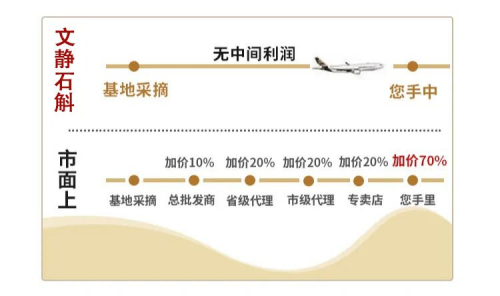 霍山铁皮石斛虽贵,但真不至于您看到的那么贵!大家经常了解的石斛价格,往往是门店的价格。从我们产地到城市门店,要经过石斛贩子、批发商、代理商、零售商四个环节,超价2倍,也就是说,源头石斛的价格一般仅需门店价格的50%: