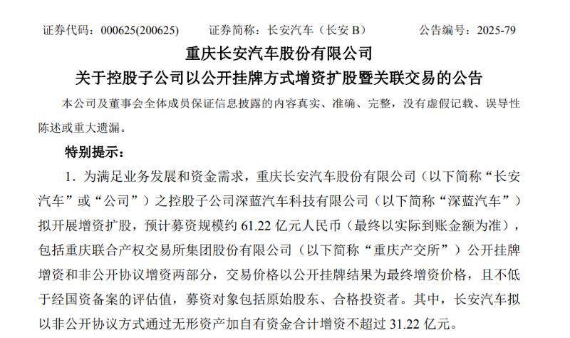 12月12日,长安汽车发布公告称,披露其控股子公司深蓝汽车的增资扩股计划,本次募资规模预计达61.22亿元,采取重庆产交所公开挂牌增资与非公开协议增资相结合的双渠道模式。其中,长安汽车拟以非公开协议方式参与增资,投入总额不超过31.22亿元,该笔资金由两部分构成——10.43亿元的无形资产(经专业评估核定)及剩余的自有现金。