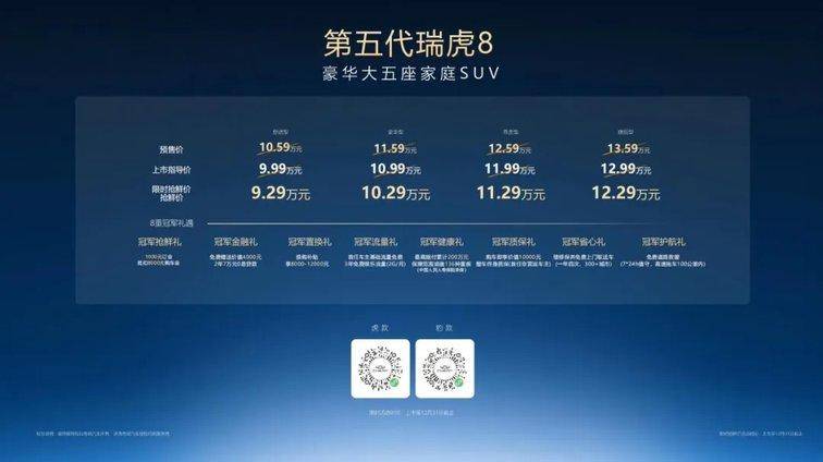 第五代瑞虎8上市限时抢鲜价为9.29万元起,同时还诚意推出8重冠军礼遇,让消费者购车更轻松、用车更省心!