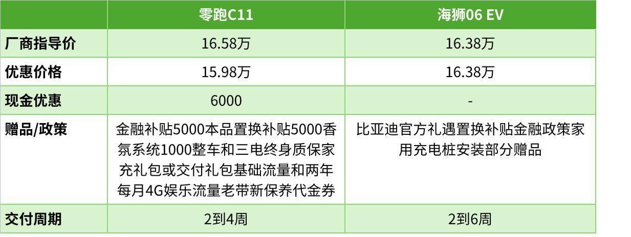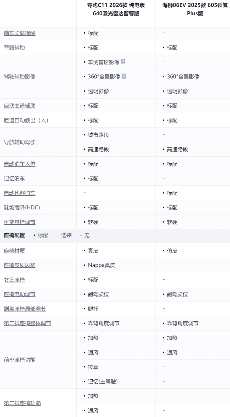 接下来咱们来看家用车比较关注的配置方面,海狮06 EV的配置很不错,但尺寸更大空间也有优势,所以真要和零跑比起来,那零跑在配置方面的优势就出来了。C11的255/45 R20大轮胎不但比比亚迪更大,还有真皮座椅,加热通风甚至按摩一应俱全。