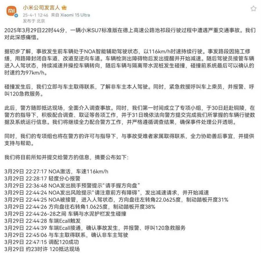 而真正将小米汽车安全议题推向风口浪尖的,是今年3月29日发生在安徽铜陵的致命事故。一辆小米SU7标准版在开启NOA(领航辅助驾驶)状态下,以高速撞上高速公路施工路段的水泥隔离桩,事故最终导致三人遇难。小米公司在后续回应中确认,事发前车辆处于NOA状态,系统检测到障碍物后曾发出提醒并减速,随后驾驶员接管,但最终未能避免碰撞。这起悲剧首次将小米智能驾驶系统在极限场景下的应对能力、人机接管的边界,以及碰撞后的安全性问题,集中摆上了台面。