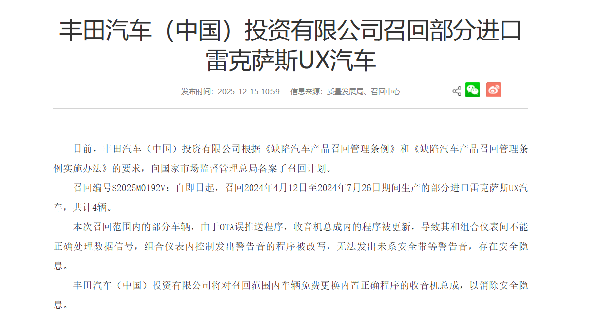 丰田汽车(中国)投资有限公司根据《缺陷汽车产品召回管理条例》的要求,向国家市场监督管理总局备案了召回计划,决定召回部分进口雷克萨斯UX汽车,涉及车辆生产日期为2024年4月12日至2024年7月26日。