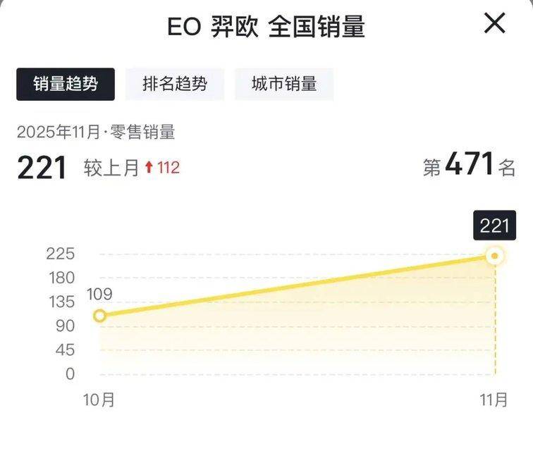 第三方平台数据显示,EO 羿欧上市后首个完整销售月(2025 年 11 月)的零售量仅为 221 辆。这一成绩与同价位自主品牌车型动辄月销过万的表现形成刺眼对比,更与北京现代的战略期待相去甚远。